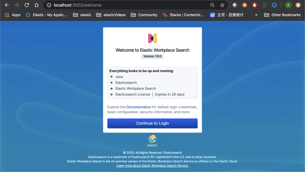 正如上面显示的那样,它显示了目前的运行状态完好。我们的 Elasticsearch 的试用版还有29天的试用期。我们点击 “Continue to Login” :