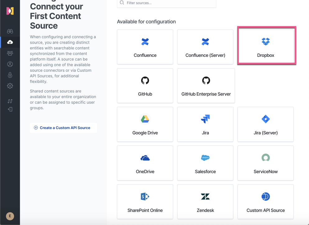 在上面,我们可以看到目前在 Workplace Search 中已经存在的一些 Connectors。在上面,有我们非常熟悉的一些工作工具。在今天的实验中,我们来添加一个我们熟悉的 Source:dropbox。我们点击上面的 Dropbox 图片: