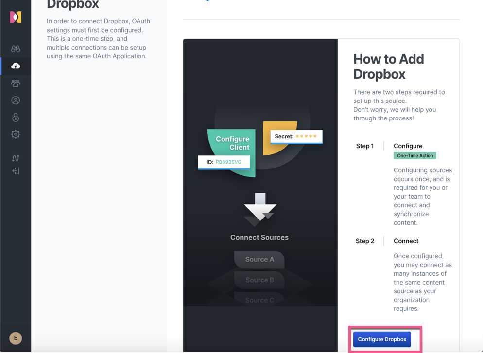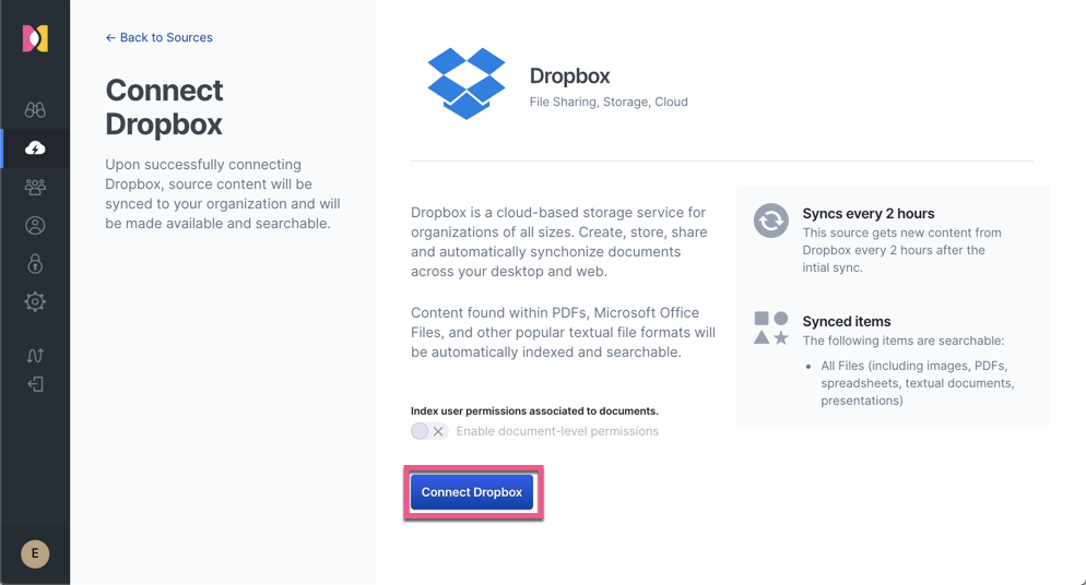 在这一节里,我们来添加一个 dropbox 的源。具体的操作流程,请参阅 “Dropbox Connector”