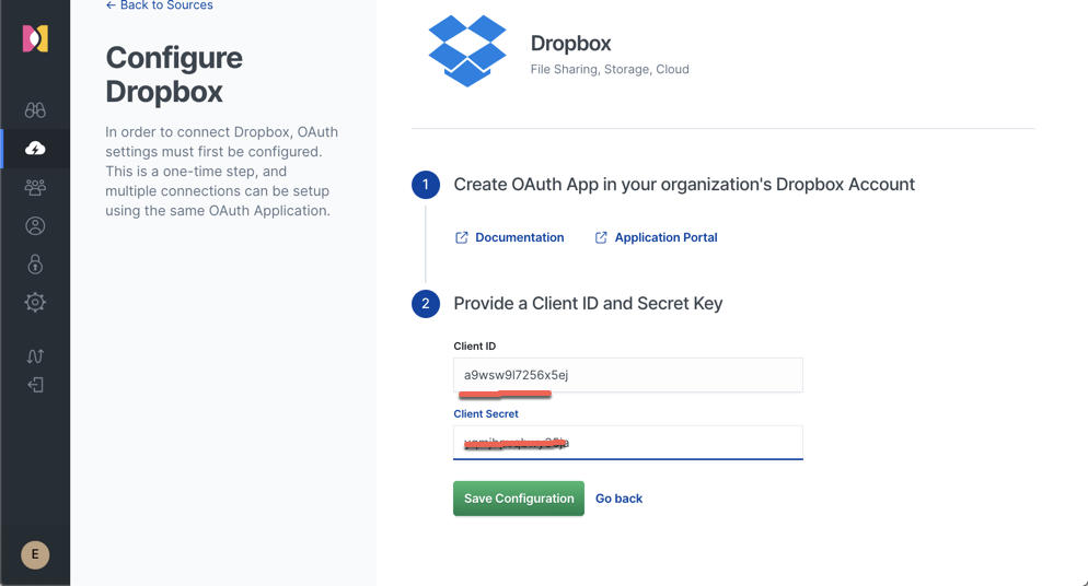 我们点击上面的 “Configure Dropbox”。我们输入自己的 ClientId 及 Secret: