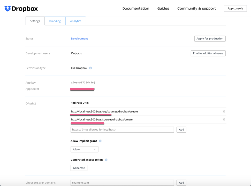我们记下上面的 App key 及 App secret,以便在下面的添加 source 时使用。如果我们想 Brand 我们自己的应用的话,我们可以点击 “Branding” tab 来配置我们自己的应用图标。