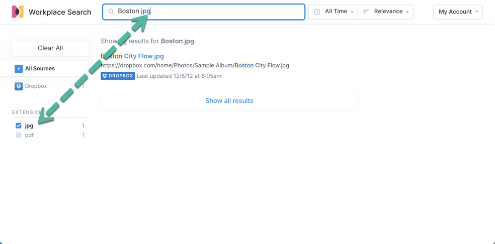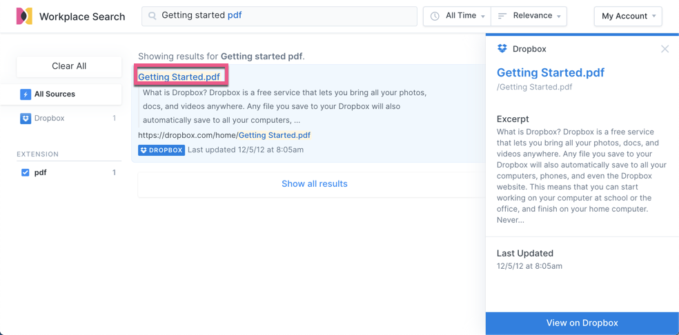 我们也可以选择 “Dropbox” 来对 Dropbox 源做单独的搜索,尽管我们目前只有一个唯一的源 Dropbox:
