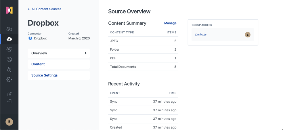 在上面我们可以看到关于 Dropbox 的所有的信息。如果大家感兴趣的话,我们可以点击 “Content” 或 “Source Settings” 来查这个源里的内容或修改这源的设置。