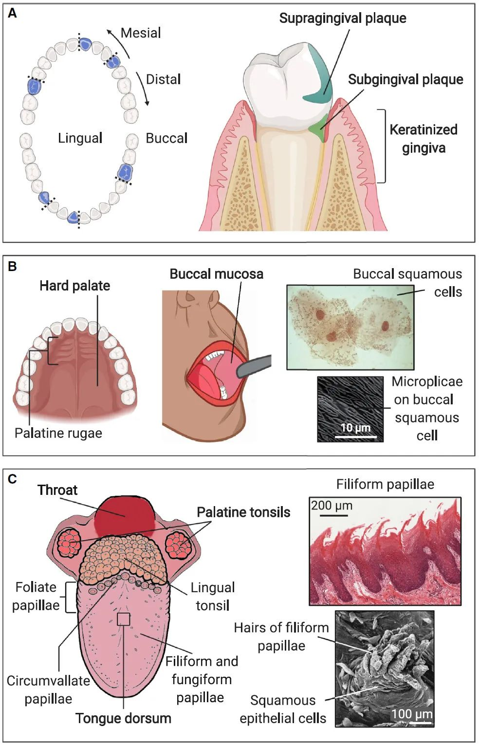 口腔内存在不同的表面形态及成分为微生物提供了不同的微生境。DNA测序样本一般通过擦除或刮取≥1cm2的面积,但是毫米级到微米级的特征变化可能会造成微生物定植的差异。HMP采样的位点以粗体标记;还显示了一些附加位点(非粗体)。