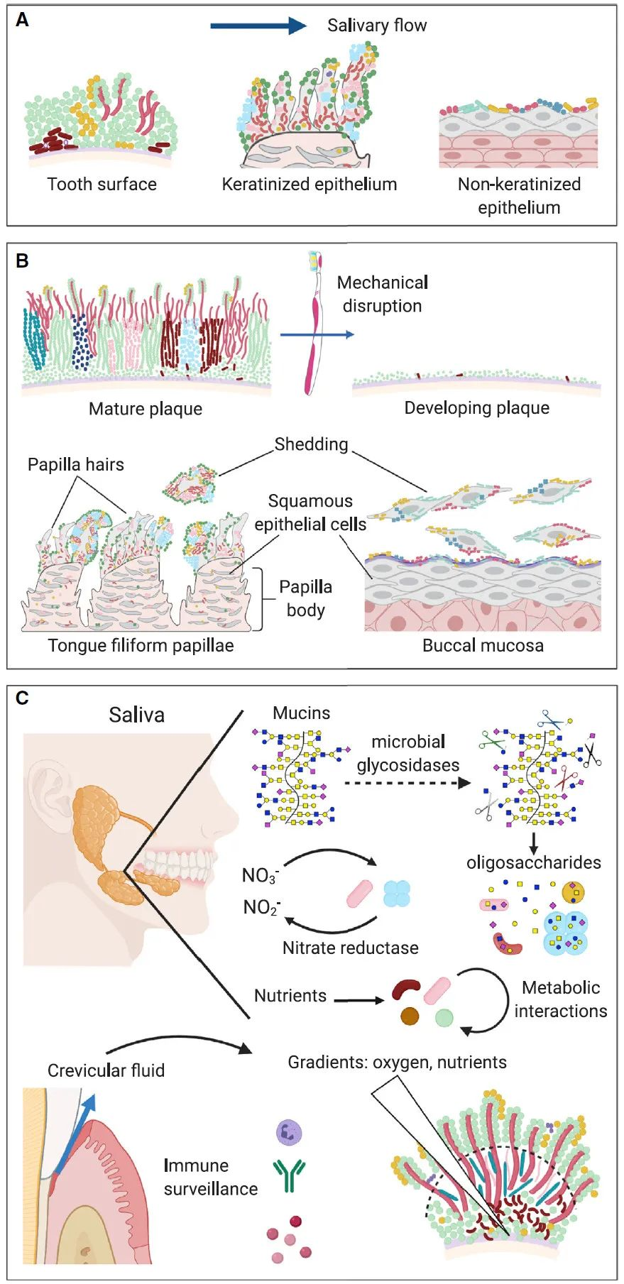 (B)脱落和定植。生物膜的机械破坏或下层底物的脱落通过新获得的底物的定植来平衡。不同口腔部位独特群落的发展是通过微生物与不同口腔基质的不同结合、残留微生物生物膜的重新生长以及生长中的生物膜被额外的分类群定殖来实现的。稳定的表面,如牙面和舌背,会形成厚厚的生物膜,而在快速脱落的表面,如颊粘膜,生物膜较薄。