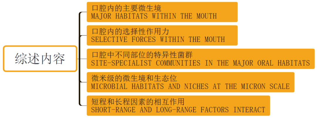 口腔内存在多个微环境,相互之间通过唾液交流。口腔内不同部位,如牙齿、舌头、颊黏膜和牙龈,含有不同的形态、底物、和稳定性,这提供了不同的微生境。口腔内微生物的空间结构是由动态平衡中的各种力量(唾液流动和粘附、脱落和附着)以及微生物和宿主之间的相互作用形成的。口腔内的每个微生境都可以形成一个复杂的、独特的微生物群落。口腔微生物群落不仅影响口腔的健康和疾病,而且在全身健康中都发挥着重要作用。定植于口腔的微生物产生空间有序的生物膜。微生境地指的是外部性-允许微生物生存的物理空间和化学环境,包括微生物群落其他成员的贡献。生态位是指生物体的活动和每个成员在群落中扮演的角色。成员之间的互动以及与环境的相互作用促进菌群成为一个整体。最近的研究强调了空间组织在人类微生物生态的各个方面的重要性,本综述重点介绍口腔内的主要微生境和生态位是如何通过微米级梯度结合短程和长程相互作用。本文讨论了微米级的结构对微生物群落的作用,并提供对它们的群落生态和潜在致病性的洞察。