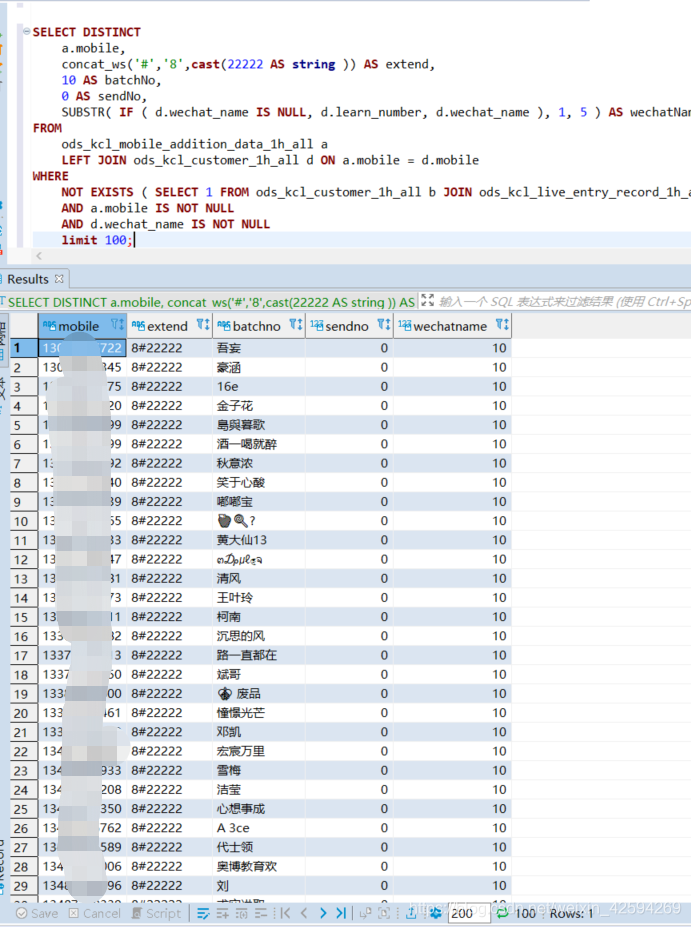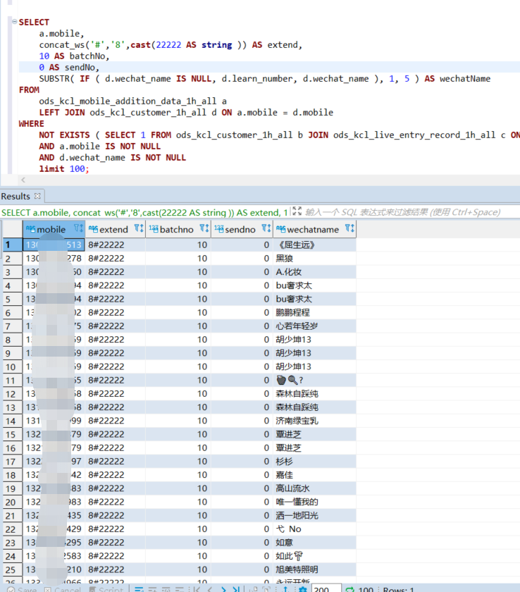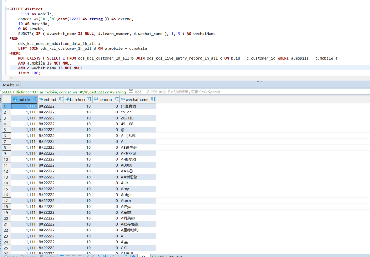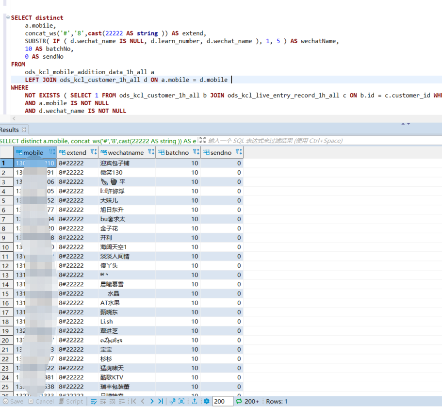SELECT DISTINCT a.mobile, concat_ws('#','8',cast(22222 AS string )) AS extend, 10 AS batchNo, 0 AS sendNo, SUBSTR( IF ( d.wechat_name IS NULL, d.learn_number, d.wechat_name ), 1, 5 ) AS wechatName FROM ods_kcl_mobile_addition_data_1h_all a LEFT JOIN ods_kcl_customer_1h_all d ON a.mobile = d.mobile WHERE NOT EXISTS ( SELECT 1 FROM ods_kcl_customer_1h_all b JOIN ods_kcl_live_entry_record_1h_all c ON b.id = c.customer_id WHERE a.mobile = b.mobile ) AND a.mobile IS NOT NULL AND d.wechat_name IS NOT NULL limit 100;