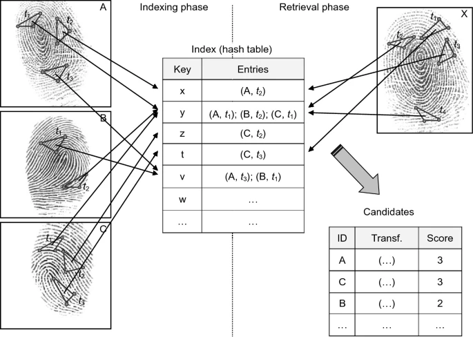 索引有两个重要方面:指纹的特征表示以及要采用的检索方法。大多数建议的解决方案都属于以下系列之一: