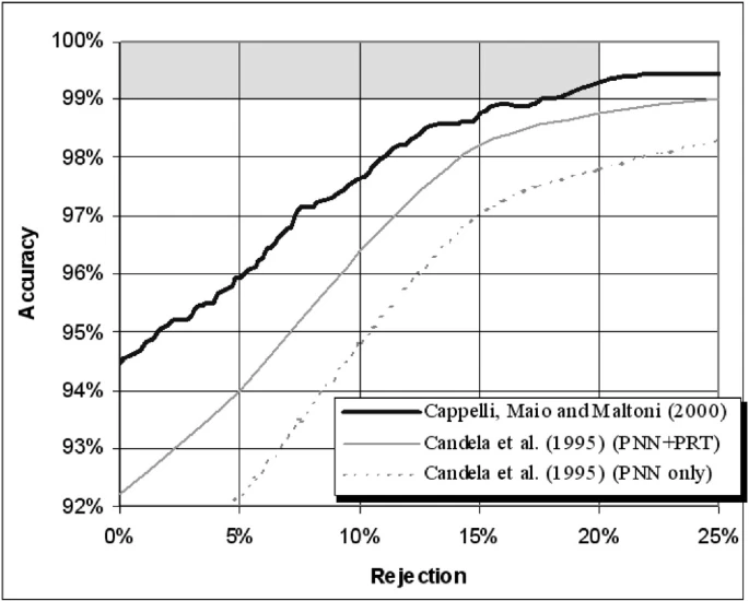 即使对于人类专家来说,质量差的指纹图像通常也很难分类:在许多应用中,指纹分类算法希望拒绝此类图像,因为这比错误的决定危害更小。出于这个原因,几种分类方法包括拒绝机制,该机制以丢弃某些指纹(即将其分类为未知)为代价来提高准确性。置信度值通常分配给分类器决策或指纹本身:拒绝仅包括丢弃置信度低于固定阈值的指纹。通过考虑拒绝率,指纹分类器的性能可以用一个图来描述,其中一个轴为拒绝率,另一个轴为错误率(或精度)。