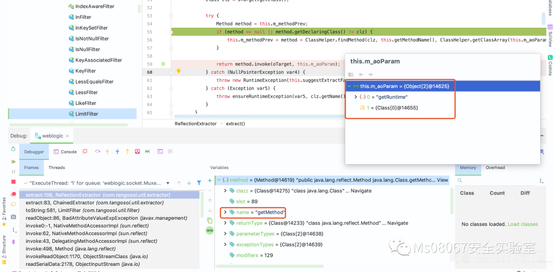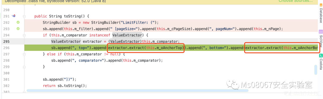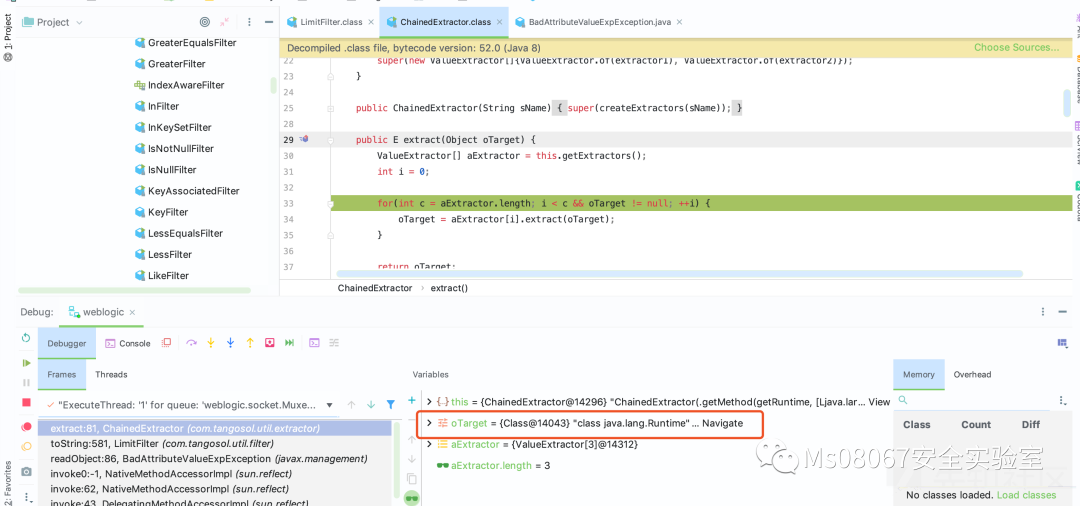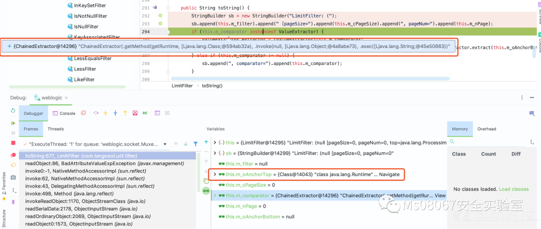 该漏洞主要是因为 com.tangosol.util.filter.LimitFilter#toString 触发,通过跟踪我们可以看到 m_oAnchorTop 为 classs java.lang.Runtime , 以及 m_comparator 为 ValueExtractor 接口的 ChainedExtractor 实现。