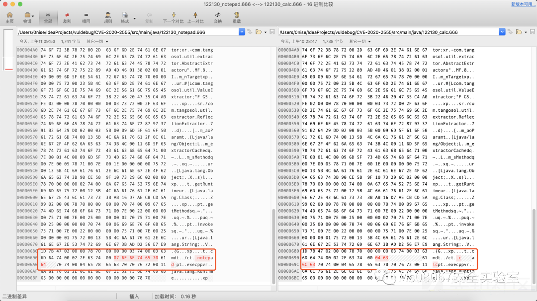 通过研究分析发现,修改参数内容时变动的内容主要为 13 5B 4C 6A 61 76 61 2E 6C 61 6E 67 2E 53 74 72 69 6E 67 3B AD D2 56 E7 E9 1D 7B 47 02 00 00 78 70 00 00 00 03 74 00 字节至 00 04 65 78 65 63 70 70 76 72 00 11 6A 61 76 61 2E 6C 61 6E 67 2E 52 75 6E 74 69 6D 65 00 00 00 00 00 00 00 00 00 00 00 78 70 的内容信息,其中左图的参数为 new String[]{"cmd", "/c", "notepad"},右图的参数为 new String[]{"cmd", "/c", "calc"}。