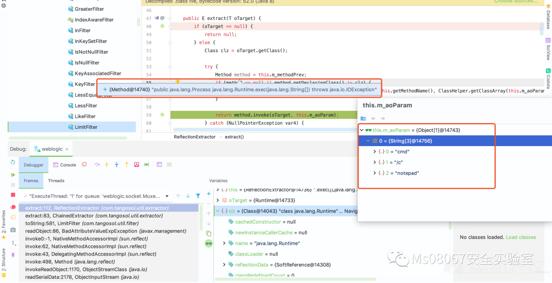 跟踪进入 aExtractor[i].extract(oTarget) 会跳入 com.tangosol.util.extractor.ReflectionExtractor#extract ,最后通过 method.invoke 反射执行,也就是说开始执行 java.lang.Runtime.getRuntime,最后讲执行的结果进行 return,类型为 java.lang.Runtime,所以整个方法执行的代码为 java.lang.Runtime.class.getMethod("getRuntime",new Class[0]);
