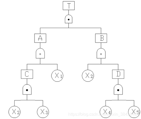 ,中间事件不断用下一层事件代替,知道全部用底事件代替,化简到若干个逻辑积的逻辑和,每个逻辑积代表一个割集,如下图: