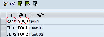 事务码SM30维护表V_001W_E,定义工厂的默认采购组织;