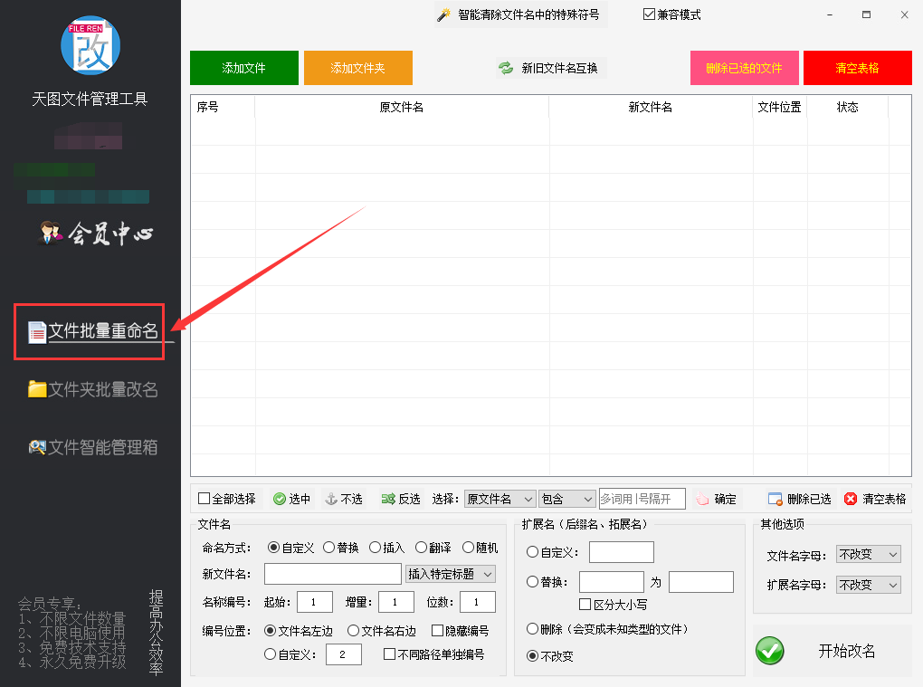 1、我们打开“天图文件管理工具”中的“文件批量重命名”功能界面。
