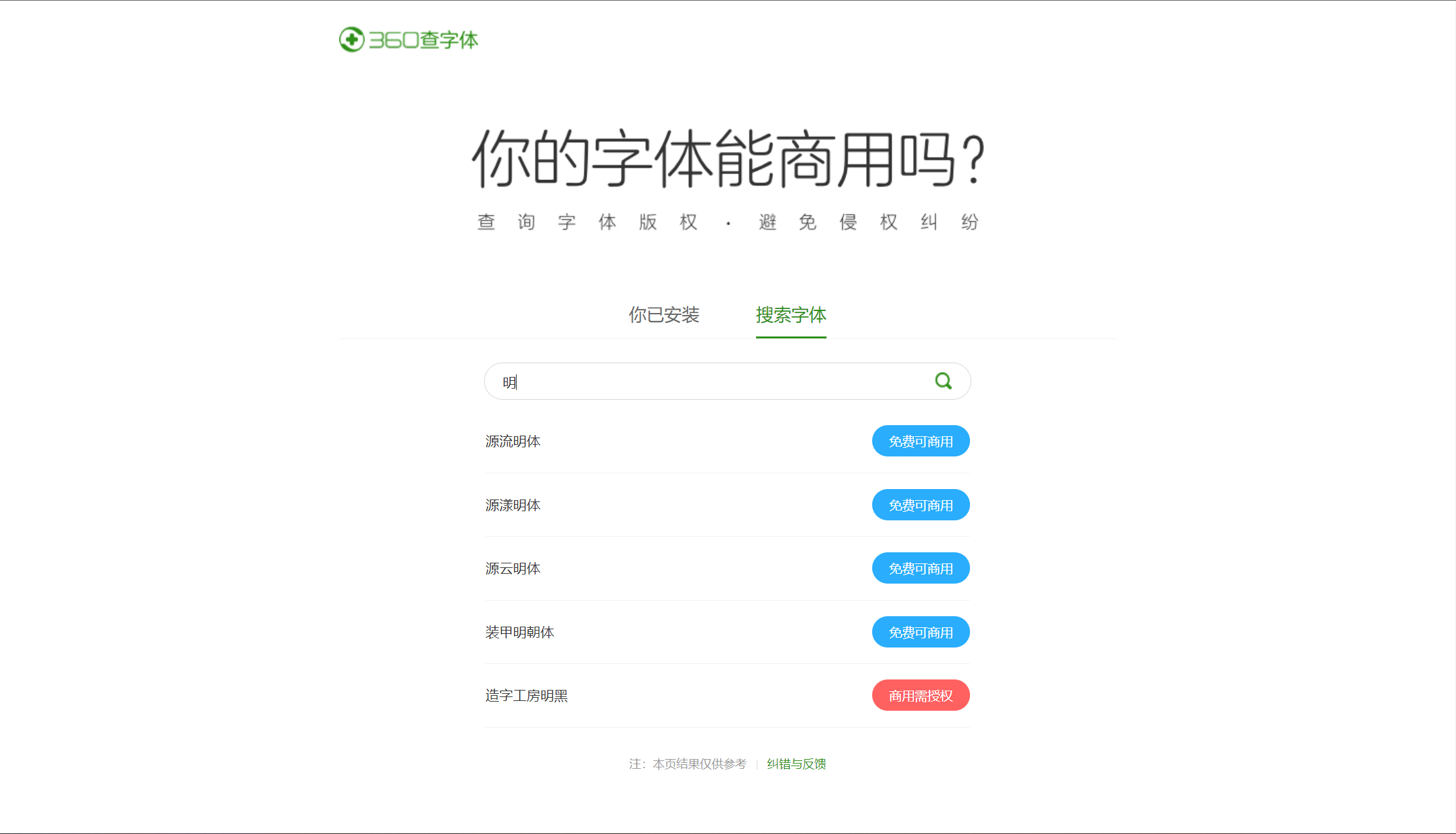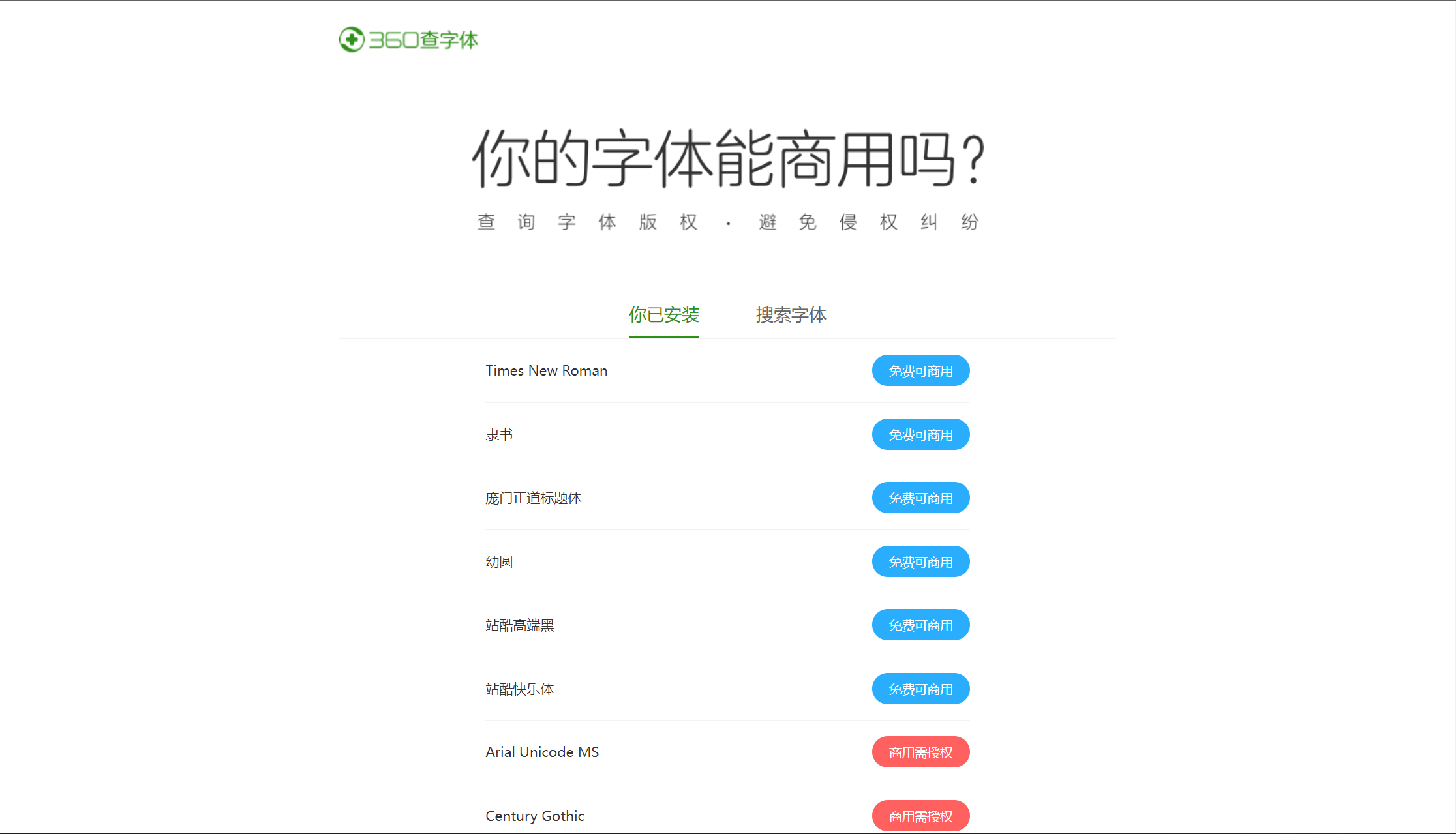 打开“360查字体”,网站会自动查找本机已安装的字体,并且用蓝色表示可以免费商用,红色表示商用需授权。我们在制作文稿或宣传物料时,就可以依据于此,使用那些可以免费商用的网站,避免纠纷。