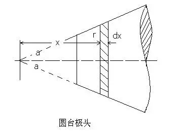 电磁铁的极头有园柱和园台之分,对于园柱极头,用纯Fe(BS为2.15T)或Fe-Co(BS为2. 4 T)合金,。采用圆台极头(或收缩极头)是尽可能在同样励磁功率条件下的提高极头中的间隙磁场,有些人根据测量国外一些电磁铁的收缩角度,盲目认为国外设计的就是最好的,说半角度认为关于半角39°圆台极头是最好的,实际上是没有科学依据。参考文献,对于圆台极头锥角有精确的计算理论(如下图),可以由库仑定律求得,使用的解析式为:ΔHx=(Ms*2π*r*dr*cosа)/[4r*μ0*(r2+x2)*cosa]