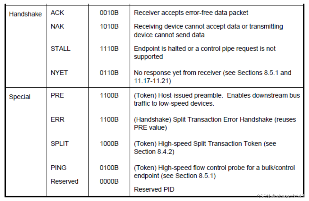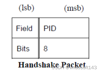 - ACK: 对于IN事务,它将由host发出;对于OUT、SETUP和PING事务,它将由device发出。