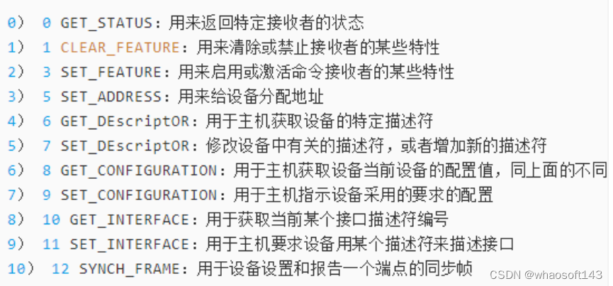 2、 bRequest:请求命令代码,在标准的USB命令中,每一个命令都定义了编号,编号的值就为字段的值,编号与命令名称如下(要注意这里的命令代码要与 其他字段结合使用,可以说命令代码是标准请求命令代码的核心,正是因为这些命令代码而决定了11个USB标准请求命令):
