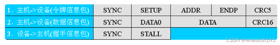 令牌包阶段——主机发送一个PID为SETUP的输出包给设备,通知设备要接收数据;