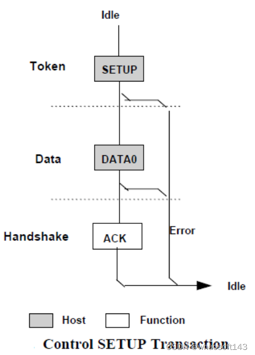 握手包阶段——设备接收到主机的命令信息后,返回ACK,此后总线进入空闲状态,并准备下一个传输(在SETUP事务后通常是一个IN或OUT事务构成的传输)