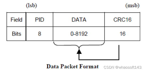 有四种类类型的数据包:DATA0, DATA1, DATA2,and MDATA,且由PID来区分。DATA0和DATA1被定义为支持数据切换同步(data toggle synchronization)。