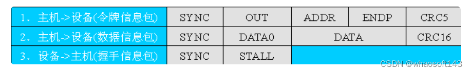 令牌包阶段——主机发送一个PID为OUT的输出包给设备,通知设备要接收数据;
