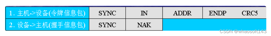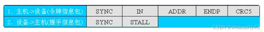 令牌包阶段——主机发送一个PID为IN的输入包给设备,通知设备要往主机发送数据;