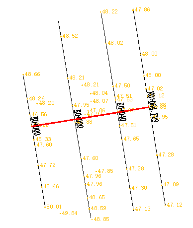 本程序输出的剖面数据格式为纵横剖面合一数轴格式,其中纵剖面只有与横剖面定位线相交处的高程。如: