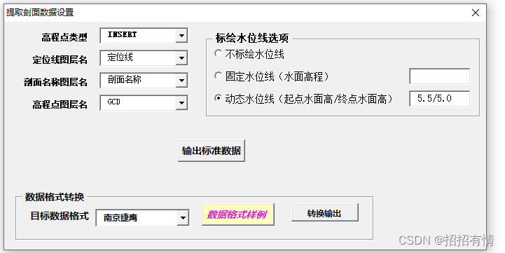 由于生成剖面图的软件不同,设计单位的要求不同,剖面数据的格式有很多,为了给甲方提交测量数据,本程序中包含了几种常用格式的转换。(其他格式的转换仅仅是文本文件的读取和输出问题,有开发能力的同行很容易做到)