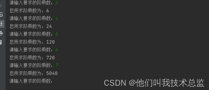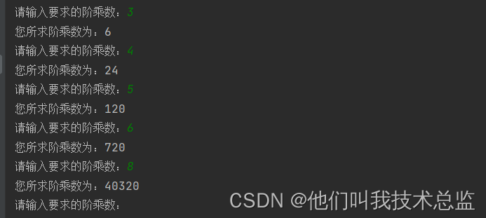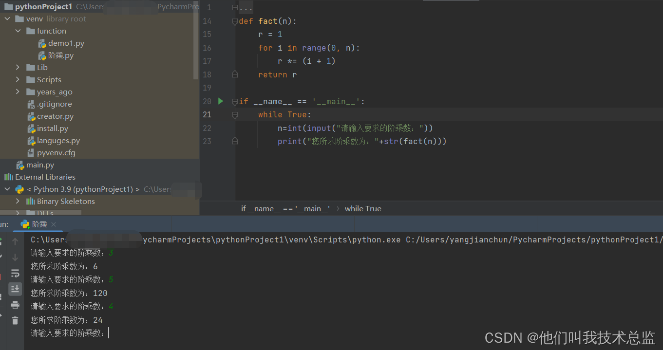 讯享网def fact(n): r = 1 for i in range(0, n): r *= (i + 1) return r if __name__ == '__main__': while True: n=int(input("请输入要求的阶乘数:")) print("您所求阶乘数为:"+str(fact(n)))