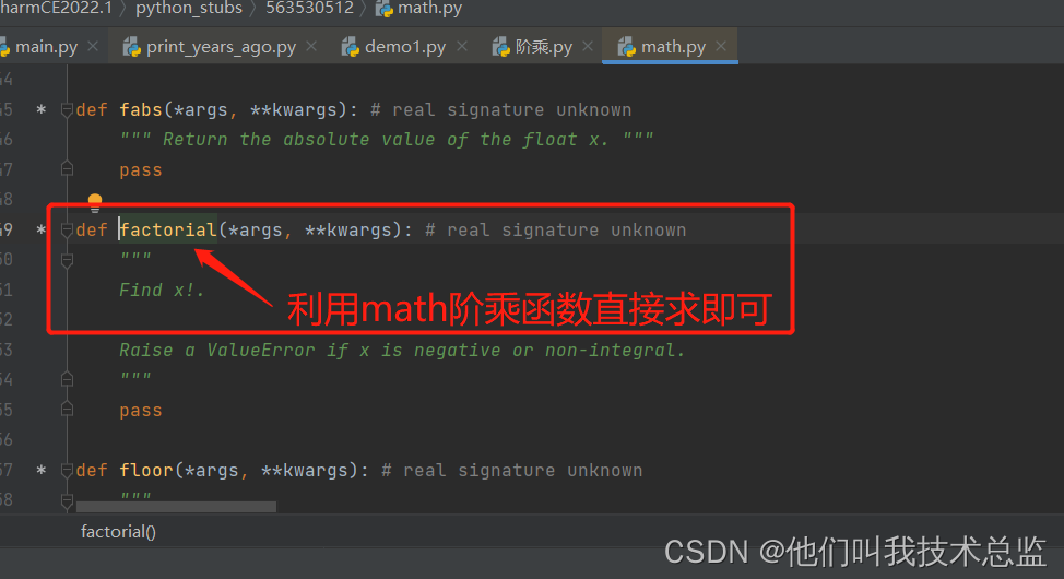 解析:利用python中math的自带函数 factorial,我们查看函数源码可以发现,该函数正式用于求阶乘的。