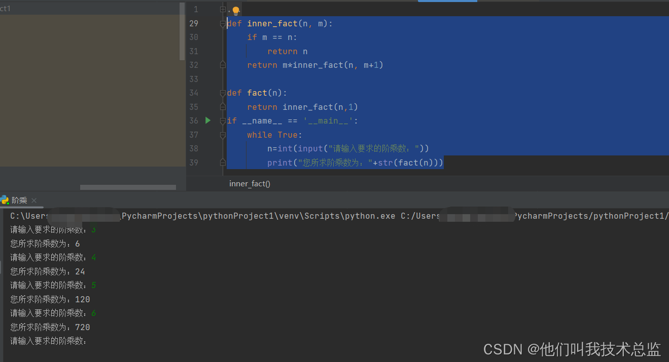 讯享网def inner_fact(n, m): if m == n: return n return m*inner_fact(n, m+1) def fact(n): return inner_fact(n,1) if __name__ == '__main__': while True: n=int(input("请输入要求的阶乘数:")) print("您所求阶乘数为:"+str(fact(n)))