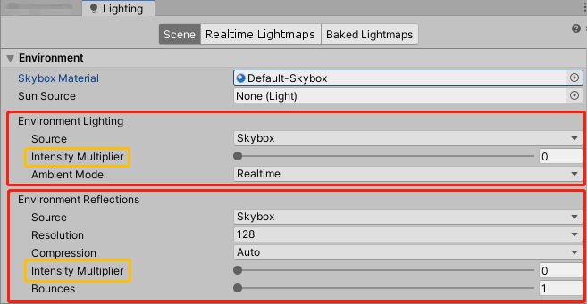 以上是新建项目的所有光照来源,①是作为物体存在,②③则是作为环境存在,需要找到Window-Rendering-Lighting面板进行调整,将②③的强度系数全部调成0后,可以排除掉环境光的影响进行光照调试