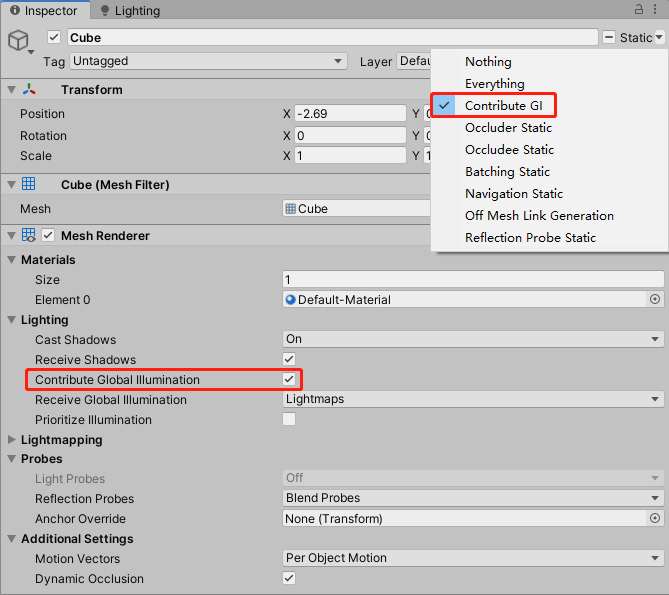 物体是否接受间接光的影响,取决于物体被标记为光照动态还是光照静态。默认情况下,我们在Unity中所创建的物体都是动态物体,可以将其标记为光照静态“Lightmap Static”(2018及以前版本)或“Contribute GI”(2019版),标记为光照静态的物体不仅可以接受间接光,其本身的颜色还会影响间接光的效果(即2019版本的,贡献全局光照)。以下为标记光照静态的两种方式