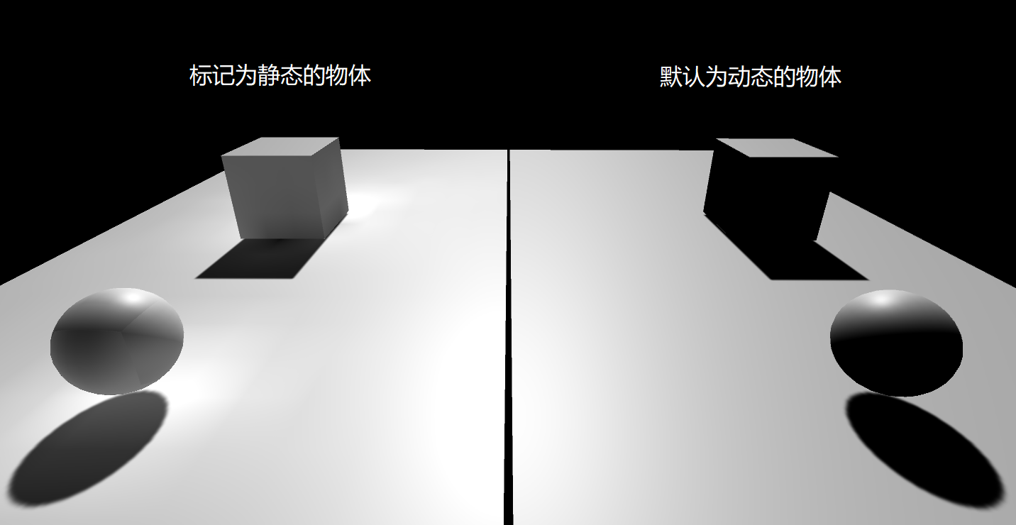 ②静态物体:受直接光和间接光的综合影响,即受到全局光照影响(见下图左侧物体)。对于创建的动态物体,我们只需要将其标记为“Lightmap Static”(2018及以前版本)或“Contribute GI”(2019版),就可以将其设定为光照静态的物体。对于这些物体,在开启全局光的条件下,Unity会自动计算全局光对其的影响,由于间接光的效果都是在游戏运行前预计算的,而且每当修改过物体后,编辑器会自动更新物体光照,因此编辑Unity项目时,编辑器右下角常可以看到计算光照的进度条。
