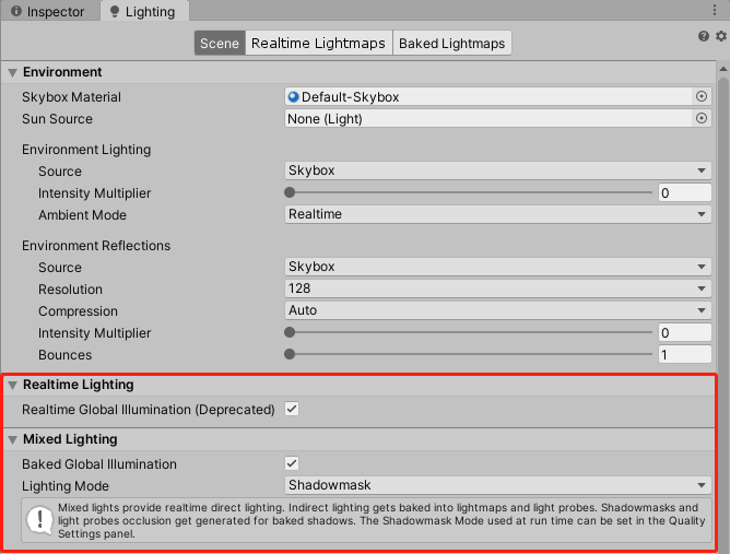 ③2019版本开始,Realtime GI被标记为弃用状态(原因不清楚),Unity建议使用Mixed Lighting(即Baked GI),Mixed Lighting提供了Realtime类型的直接光,而间接光通过烘焙或光照探针来提供。