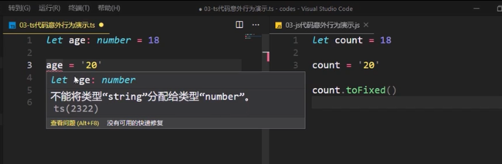 ts数据类型规范 ts会检查变量类型的变化,而js没有会在控制台报TypeError类型错误