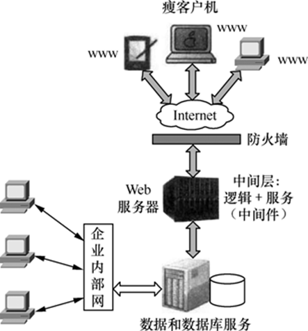 这种架构是对客户机和中间层的内涵进行改动后的中间层计算架构的扩展。对中间层的改动体现在中间层和客户机之间增加了一层Web服务器层,Web服务器可以将中间件的各种差异屏蔽掉,提供一种通用的用户访问界面。对客户机的改动则体现在负载的进一步缩减,从承载部分计算任务改变为只显示和运行一些基于浏览器的脚本程序的状态。