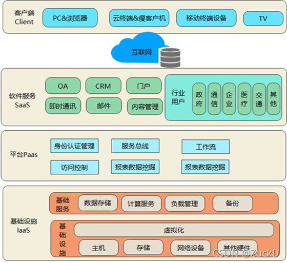 比较公认的云架构(基于面向服务)是划分为:基础设施层、平台层和软件服务层三个层次的。对应名称为IaaS,PaaS和SaaS。