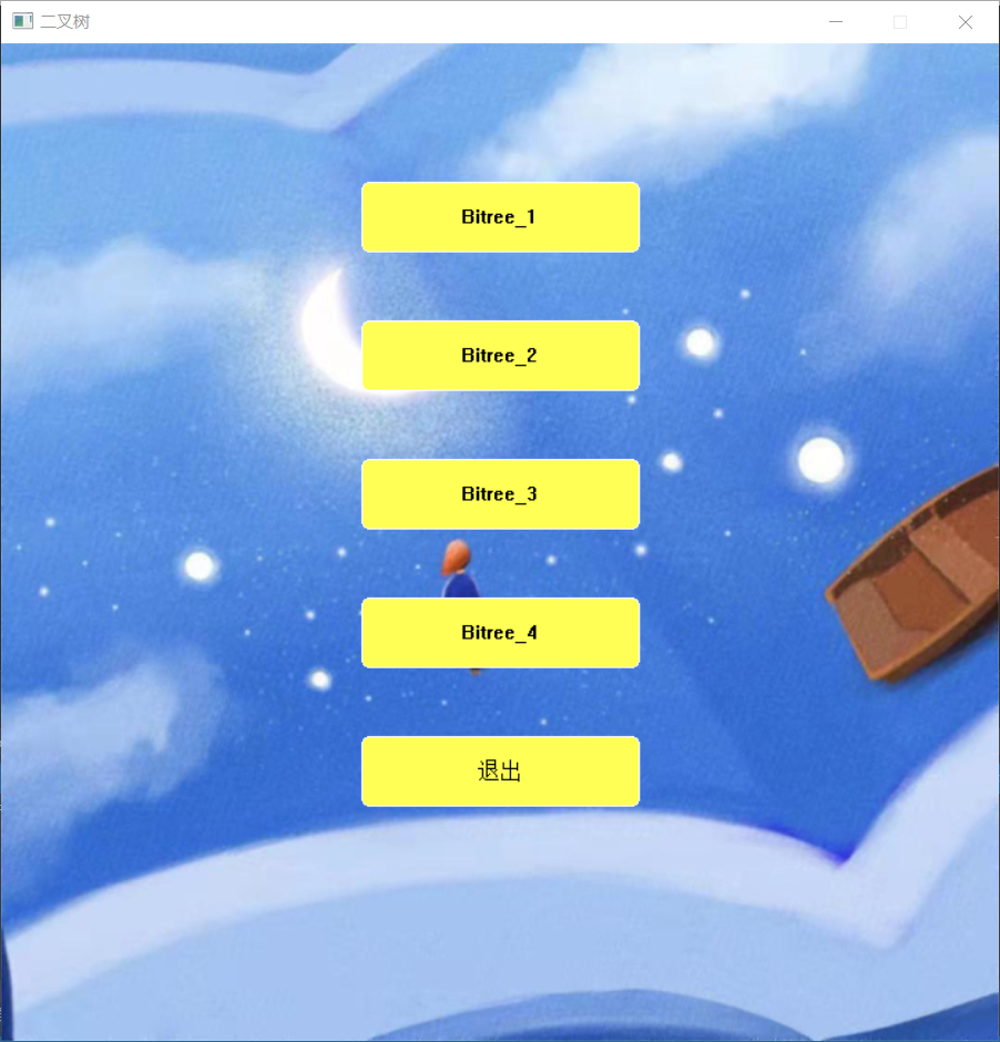 int main() { initgraph(720, 720, EW_SHOWCONSOLE); ifstream file; BiTree T; file.open("test.txt"); file >> s1 >> s2 >> s3 >> s4; showjpg(); BeginBatchDraw(); ExMessage msg; int x[5], y[5], w[5], h[5]; x[0] = 260; y[0] = 100; w[0] = 200; h[0] = 50; setfillcolor(YELLOW); fillroundrect(x[0], y[0], x[0] + w[0], y[0] + h[0], 10, 10); botton_table(x[0], y[0], w[0], h[0], "Bitree_1"); x[1] = 260; y[1] = 200; w[1] = 200; h[1] = 50; setfillcolor(YELLOW); fillroundrect(x[1], y[1], x[1] + w[1], y[1] + h[1], 10, 10); botton_table(x[0], y[0], w[0], h[0], "Bitree_2"); x[2] = 260; y[2] = 300; w[2] = 200; h[2] = 50; setfillcolor(YELLOW); fillroundrect(x[2], y[2], x[2] + w[2], y[2] + h[2], 10, 10); botton_table(x[2], y[2], w[2], h[2], "Bitree_3"); x[3] = 260; y[3] = 400; w[3] = 200; h[3] = 50; setfillcolor(YELLOW); fillroundrect(x[3], y[3], x[3] + w[3], y[3] + h[3], 10, 10); botton_table(x[3], y[3], w[3], h[3], "Bitree_4"); x[4] = 260; y[4] = 500; w[4] = 200; h[4] = 50; setfillcolor(YELLOW); fillroundrect(x[4], y[4], x[4] + w[4], y[4] + h[4], 10, 10); botton_table(x[4], y[4], w[4], h[4], "退出"); bool checkt = 0; while (1) { if (peekmessage(&msg, EM_MOUSE)) { switch (msg.message) { case WM_LBUTTONDOWN://点击 if (msg.x >= x[0] && msg.x <= x[0] + w[0] && msg.y >= y[0] && msg.y <= y[0] + h[0] ) { s = s1; ip = 0; cleardevice(); CreateBiTree(&T); PrintBiTree(T); Sleep(800); cleardevice(); showjpg(); Orderchoice(T); } if (msg.x >= x[1] && msg.x <= x[1] + w[1] && msg.y >= y[1] && msg.y <= y[1] + h[1] ) { s = s2; ip = 0; cleardevice(); CreateBiTree(&T); PrintBiTree(T); Sleep(800); cleardevice(); showjpg(); Orderchoice(T); } if (msg.x >= x[2] && msg.x <= x[2] + w[2] && msg.y >= y[2] && msg.y <= y[2] + h[2]) { s = s3; ip = 0; cleardevice(); CreateBiTree(&T); PrintBiTree(T); Sleep(800); cleardevice(); showjpg(); Orderchoice(T); } if (msg.x >= x[3] && msg.x <= x[3] + w[3] && msg.y >= y[3] && msg.y <= y[3] + h[3]) { s = s4; ip = 0; CreateBiTree(&T); cleardevice(); PrintBiTree(T); Sleep(800); cleardevice(); showjpg(); Orderchoice(T); } if (msg.x >= x[4] && msg.x <= x[4] + w[4] && msg.y >= y[4] && msg.y <= y[4] + h[4]) { checkt = true; } FlushBatchDraw(); case WM_MOUSEFIRST://移动 if (msg.x >= x[0] && msg.x <= x[0] + w[0] && msg.y >= y[0] && msg.y <= y[0] + h[0]) { setfillcolor(RED); fillroundrect(x[0], y[0], x[0] + w[0], y[0] + h[0], 10, 10); botton_table(x[0], y[0], w[0], h[0], "Bitree_1"); } else { setfillcolor(YELLOW); fillroundrect(x[0], y[0], x[0] + w[0], y[0] + h[0], 10, 10); botton_table(x[0], y[0], w[0], h[0], "Bitree_1"); } if (msg.x >= x[1] && msg.x <= x[1] + w[1] && msg.y >= y[1] && msg.y <= y[1] + h[1]) { setfillcolor(RED); fillroundrect(x[1], y[1], x[1] + w[1], y[1] + h[1], 10, 10); botton_table(x[1], y[1], w[1], h[1], "Bitree_2"); } else { setfillcolor(YELLOW); fillroundrect(x[1], y[1], x[1] + w[1], y[1] + h[1], 10, 10); botton_table(x[1], y[1], w[1], h[1], "Bitree_2"); } if (msg.x >= x[2] && msg.x <= x[2] + w[2] && msg.y >= y[2] && msg.y <= y[2] + h[2]) { setfillcolor(RED); fillroundrect(x[2], y[2], x[2] + w[2], y[2] + h[2], 10, 10); botton_table(x[2], y[2], w[2], h[2], "Bitree_3"); } else { setfillcolor(YELLOW); fillroundrect(x[2], y[2], x[2] + w[2], y[2] + h[2], 10, 10); botton_table(x[2], y[2], w[2], h[2], "Bitree_3"); } if (msg.x >= x[3] && msg.x <= x[3] + w[3] && msg.y >= y[3] && msg.y <= y[3] + h[3]) { setfillcolor(RED); fillroundrect(x[3], y[3], x[3] + w[3], y[3] + h[3], 10, 10); botton_table(x[3], y[3], w[3], h[3], "Bitree_4"); } else { setfillcolor(YELLOW); fillroundrect(x[3], y[3], x[3] + w[3], y[3] + h[3], 10, 10); botton_table(x[3], y[3], w[3], h[3], "Bitree_4"); } if (msg.x >= x[4] && msg.x <= x[4] + w[4] && msg.y >= y[4] && msg.y <= y[4] + h[4]) { setfillcolor(RED); fillroundrect(x[4], y[4], x[4] + w[4], y[4] + h[4], 10, 10); botton_table(x[4], y[4], w[4], h[4], "退出"); } else { setfillcolor(YELLOW); fillroundrect(x[4], y[4], x[4] + w[4], y[4] + h[4], 10, 10); botton_table(x[4], y[4], w[4], h[4], "退出"); } } EndBatchDraw(); } if (checkt) { break; } } return 0; }
