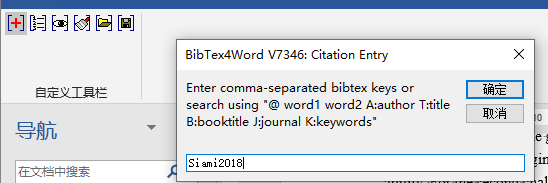 Step3: 将鼠标放在正文准备插入参考文献的位置,点击第一个图像[+],输入该文献的keywords,点击确定。