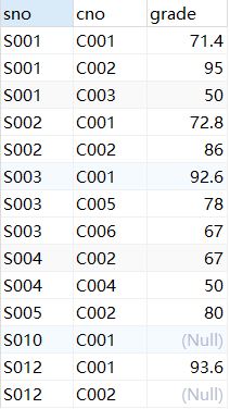 讯享网insert into sc(sno,cno,grade)values('S012','C001','90'),('S012','C002',null)