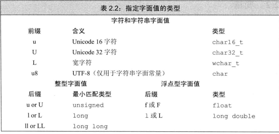 L' a'//宽字符型字面值,类型是wchar_ t u8"hi !"// utf-8字符串字面值(utf-8用8位编码一个Unicode字符) 42ULL//无符号整型字面值,类型是unsigned long long 1E-3F//单精度浮点型字面值,类型是float 3.14159L//扩展精度浮点型字面值,类型是long double