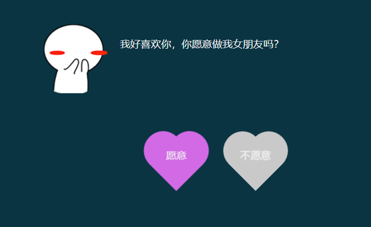 <div class="share_img"><img src="images/a8b.png" alt=""></div> <div class="page_one"> <div class="content"> <div class="text_wrapper"> <img src="images/a8.png" alt=""> <div class="text"> 我好喜欢你,你愿意做我女朋友吗? </div> </div> </div> <div class="btn-groups"> <div class="heart-btn"> <div id="yes" class="btn btn-a"><span>愿意</span></div> </div> <div id="no" class="btn btn-b"><span>不愿意</span></div> </div> </div> <div class="page_two hide"> <div class="type_words"></div> </div>