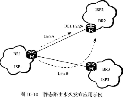 BR1、BR2、BR3分属ISP1、ISP2、ISP3。从BR1到BR2有两条链路(LinkA和LinkB)可达,但ISP1希望流量都通过LinkA直接转发到ISP2,而不从ISP3穿越。这时可以配置ISP1到ISP2的静态路由为永久发布的。