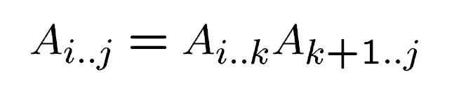 让我们这样来想,无论我们以一个什么样的乘法顺序来计算,最后一步都是一样的,即把最后生成的两个中间矩阵Ai...k和Ak+1...j相乘,其中k可以是在合法范围内的任意一个值: