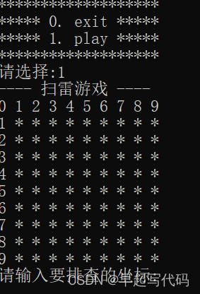 void DisplayBoard(char board[ROWS][COLS], int row, int col) { int x = 0; int y = 0; printf("---- 扫雷游戏 ----\n"); for (y = 0; y <= col; y++) { printf("%d ", y); } printf("\n"); for (x = 1; x <= row; x++) { printf("%d ", x); for (y = 1; y <= col; y++) { printf("%c ", board[x][y]); } printf("\n"); } }