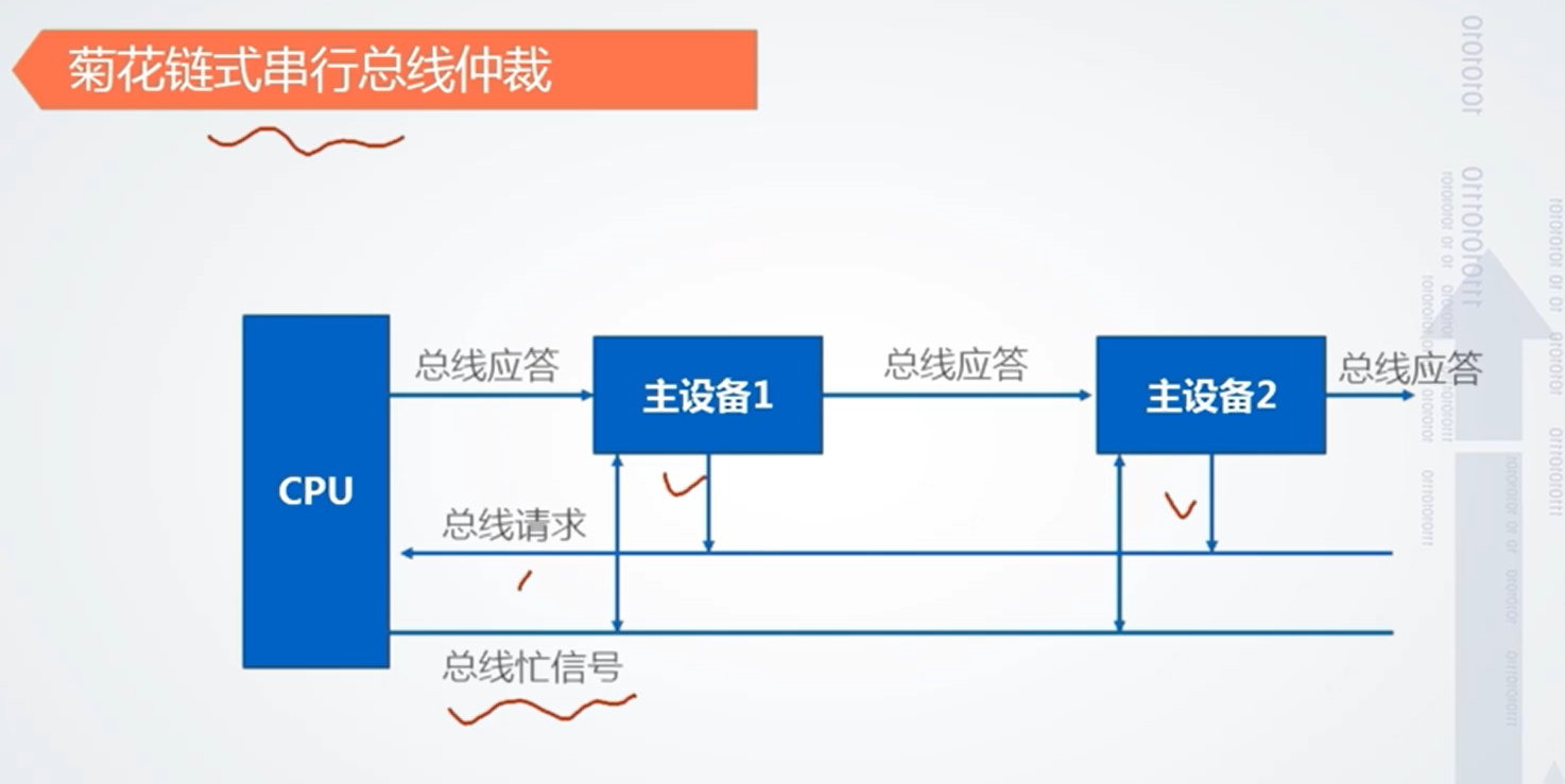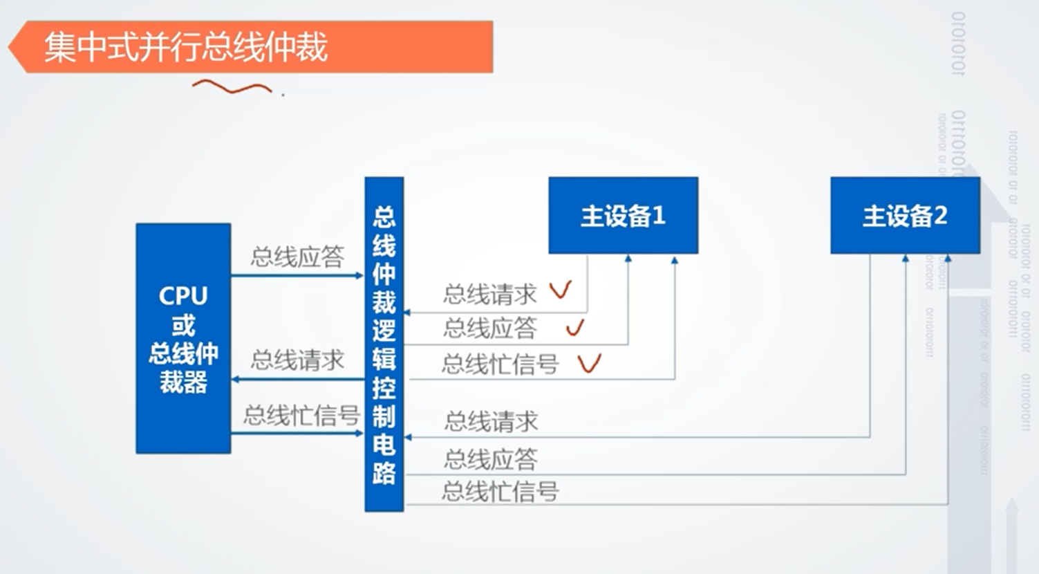 每一个主设备通过三条线和CPU连接起来,当总线忙信号无效时,主设备能够通过请求线发送请求信号。