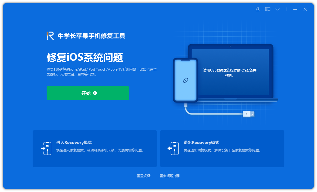 第一步:下载安装好牛学长苹果手机修复工具,通过数据线连接设备与电脑,点击“修复iOS系统问题”下方的“开始”按键。